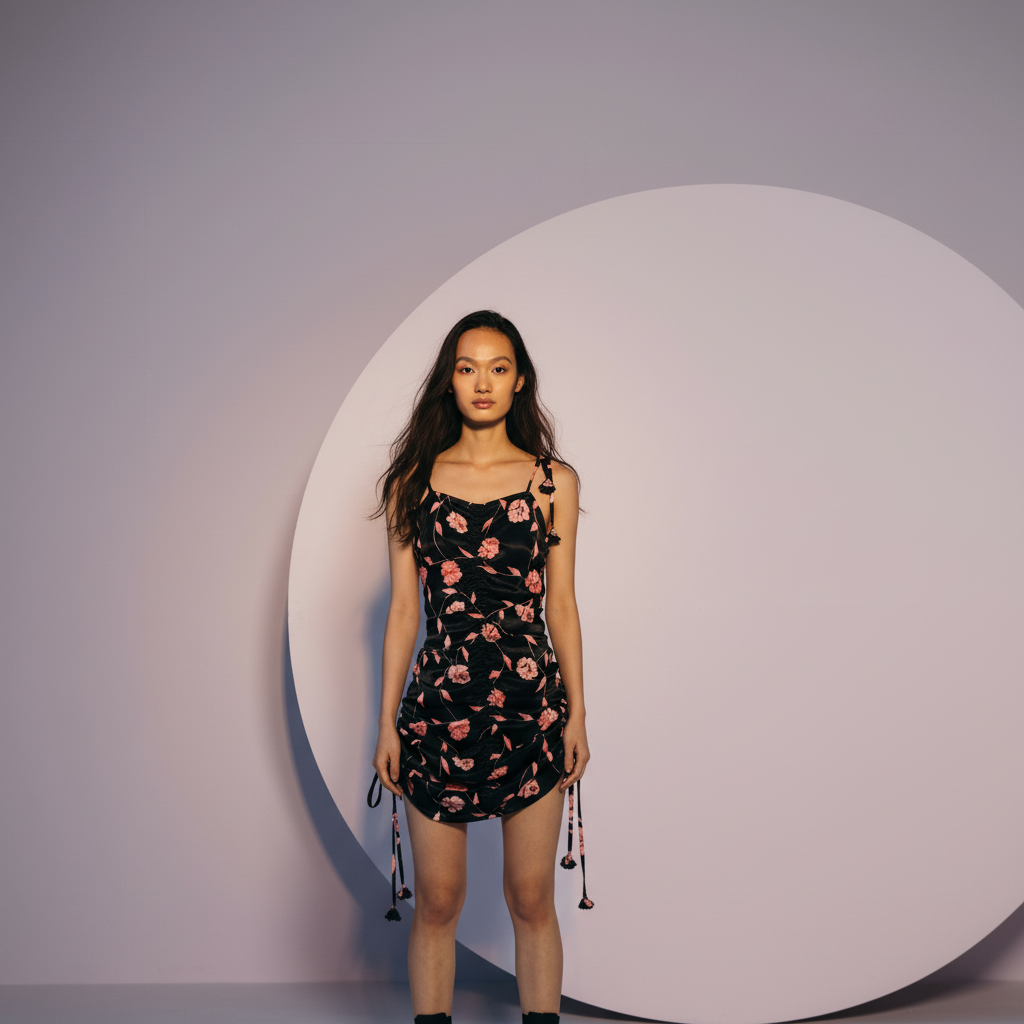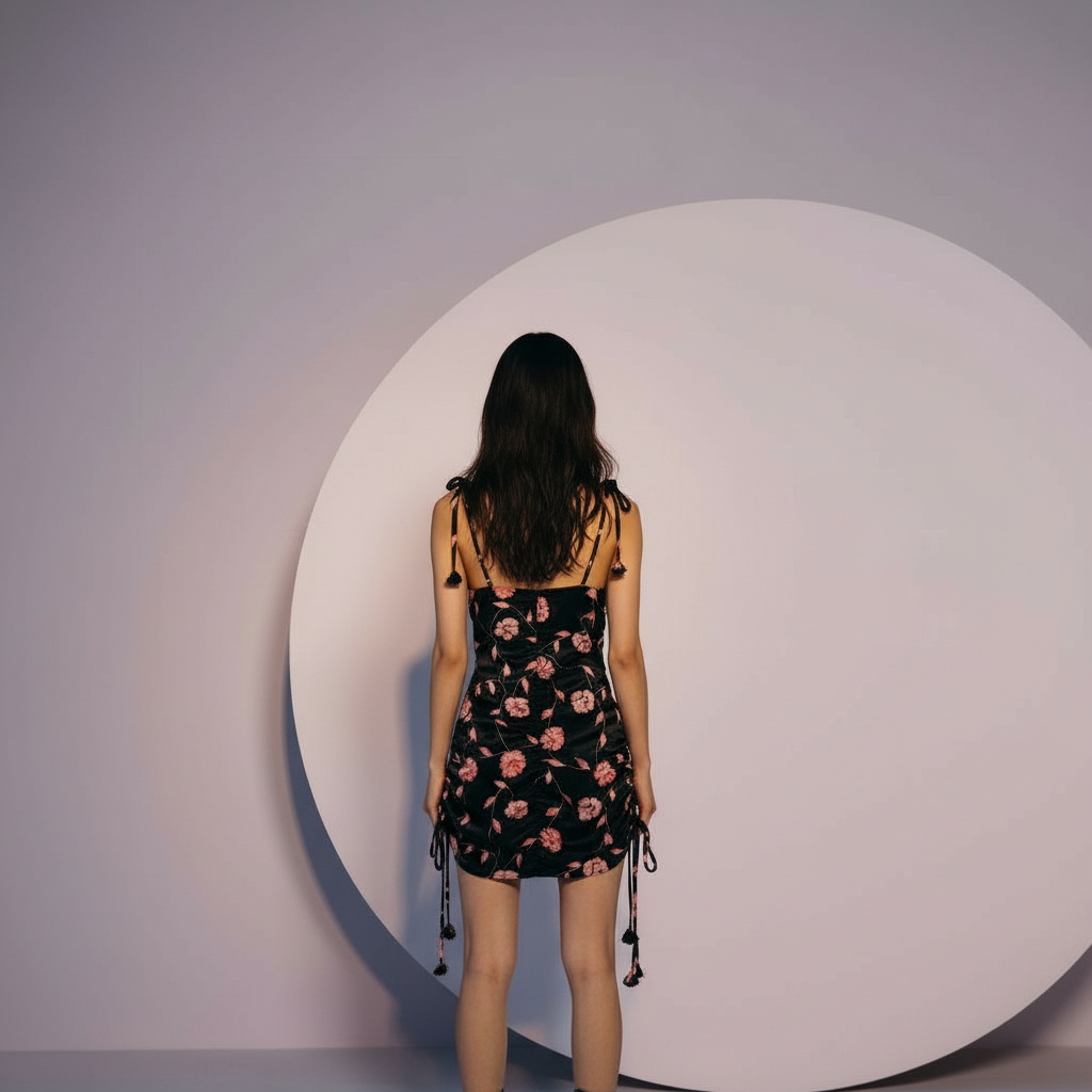 Mini strappy dress with adjustable ties on either sides embellished with upcycled hand-made tassels. Pair with the SIlina Trench for an ounce of extra.