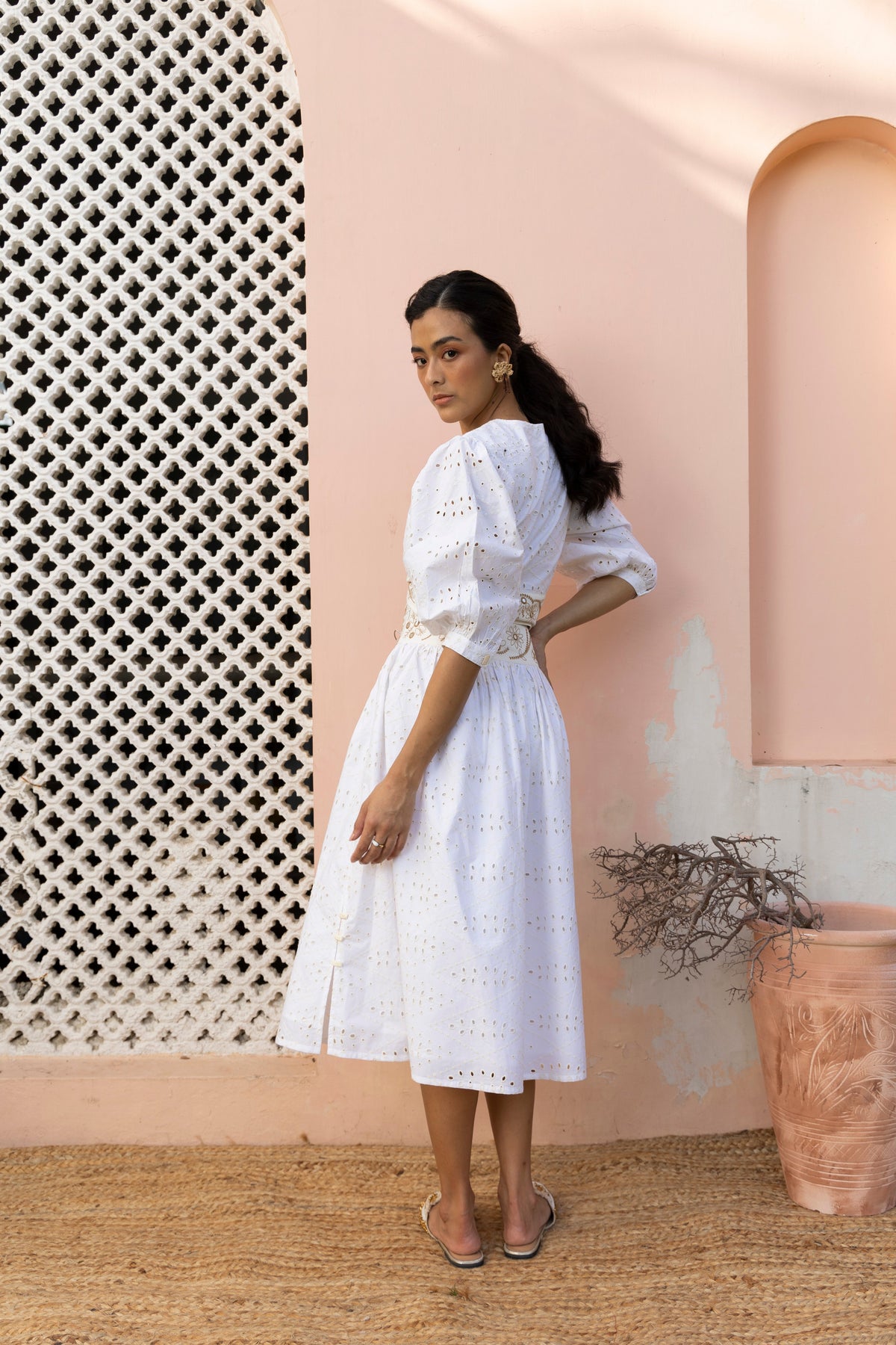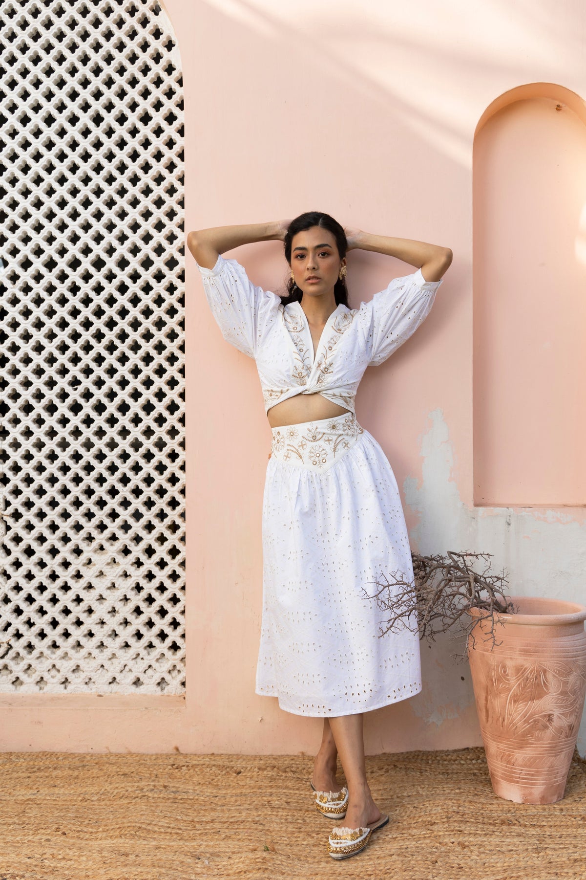Cropped & knotted- just the sweetest combo for a summer top! To top it off, mirror work and perforated embroideries makes this top a true eye-catcher. Pair with the Cudi Skirt and dip yourself in embroidery goodness head to toe!