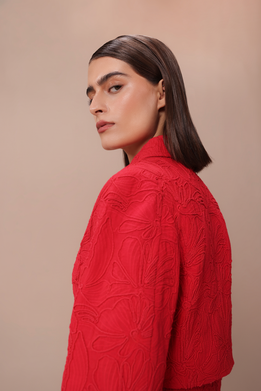The Lamie Blazer Set is the ultimate holiday ensemble, featuring vibrant red hues that catch the light with every step. This set includes a cropped oversized blazer with rounded hems and floral embroideries, secured at the front with a delicate hook and eye. The matching mini skirt showcases a chic wrap effect, complete with a convenient side zipper. Embrace the holiday spirit in style with this stunning set!