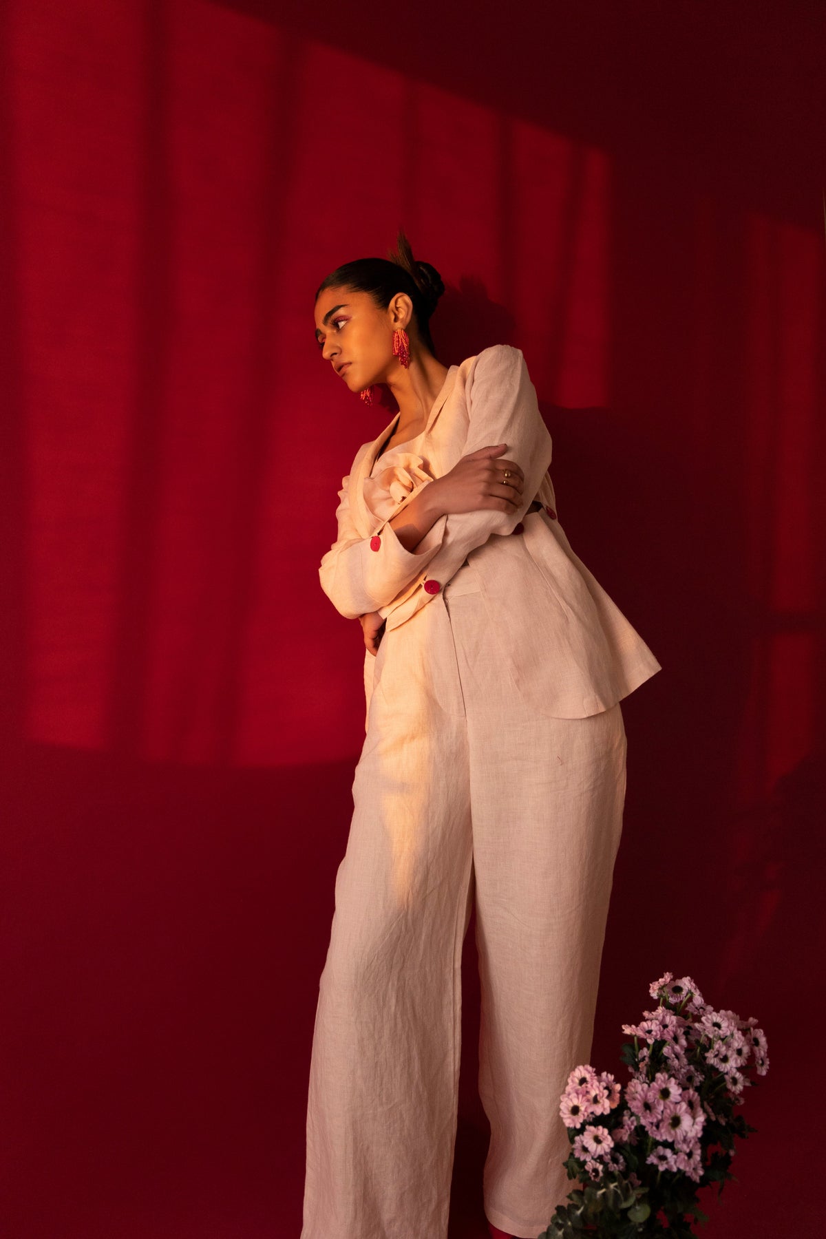 A cool high-waisted fit, the Lurelly Pant is a linen staple. Two show flap back pockets are embellished with delicious red buttoning.