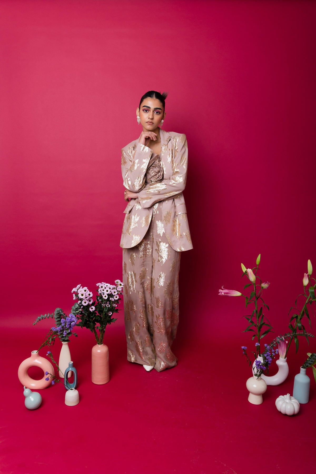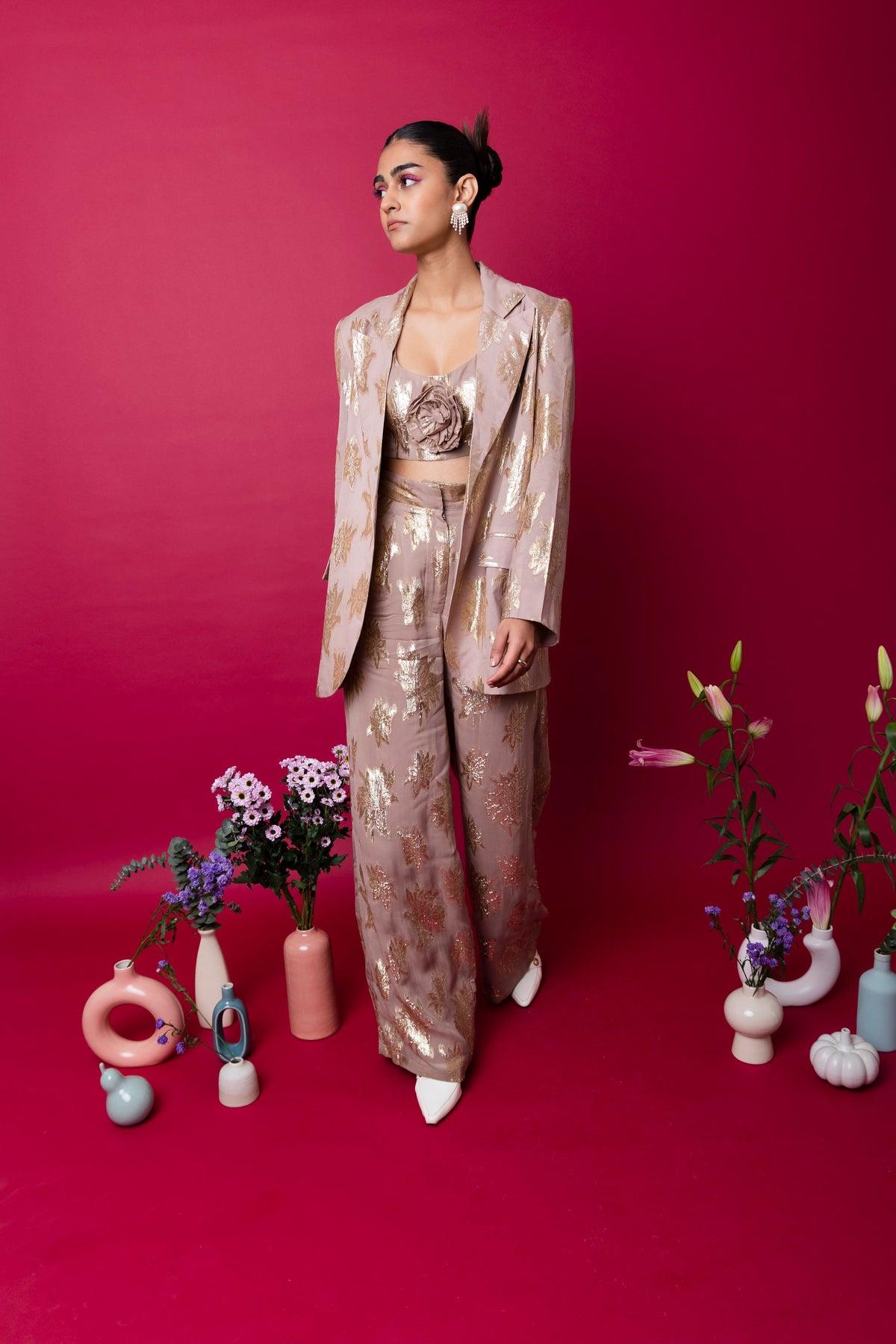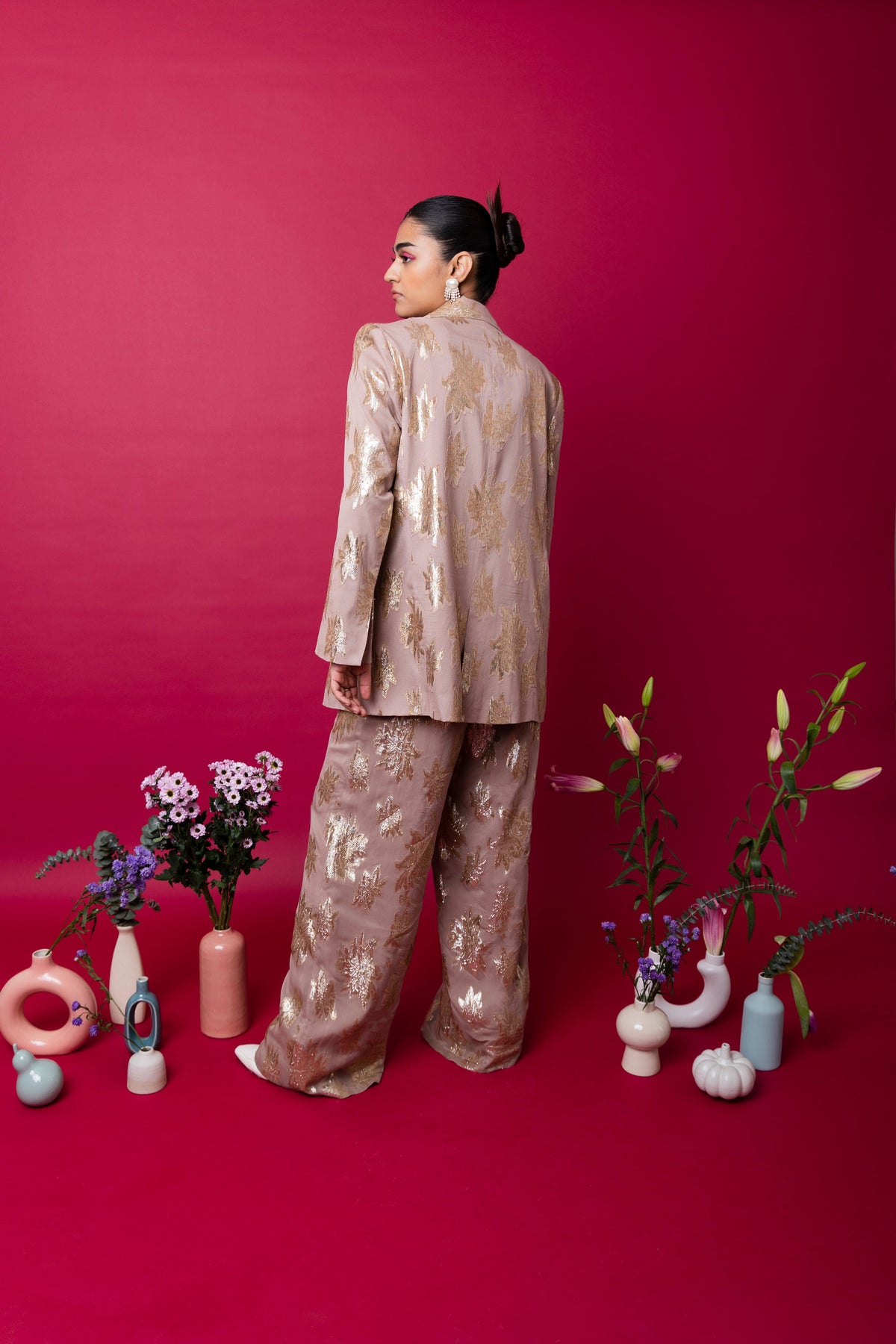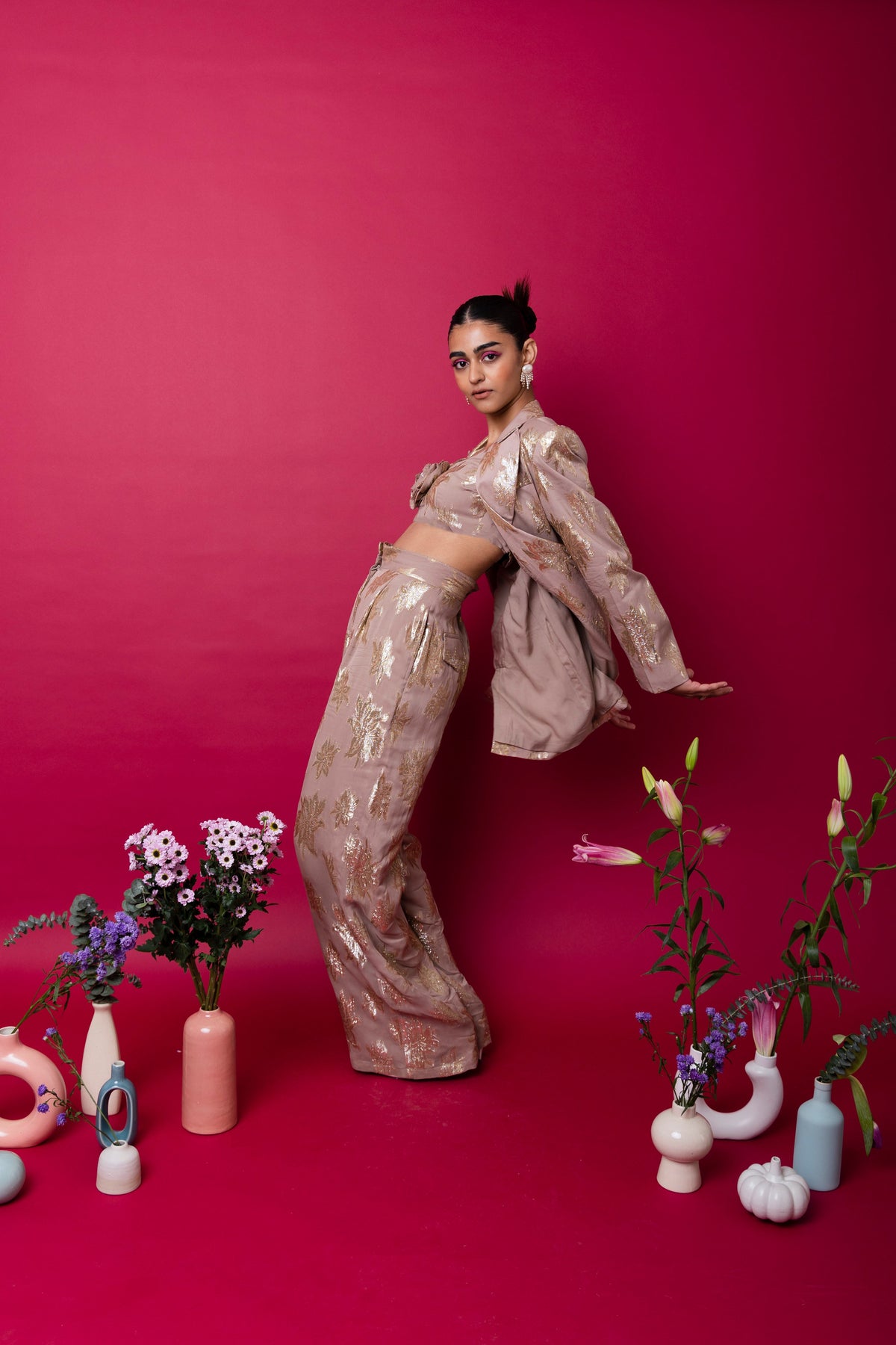 A cool high waisted fit, the Oxy Pant is drenched in lurex for all the luxe vibes. Two show flap back pockets at the back.