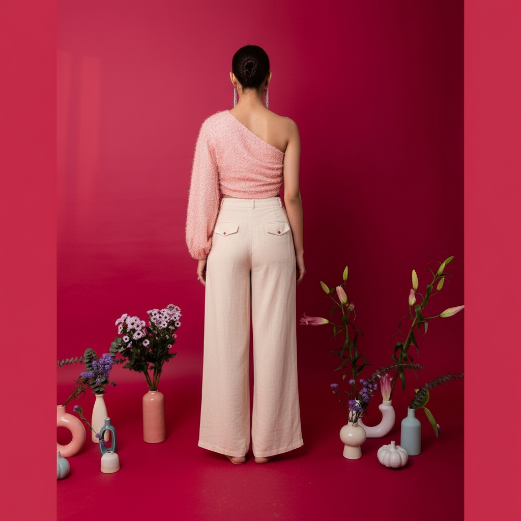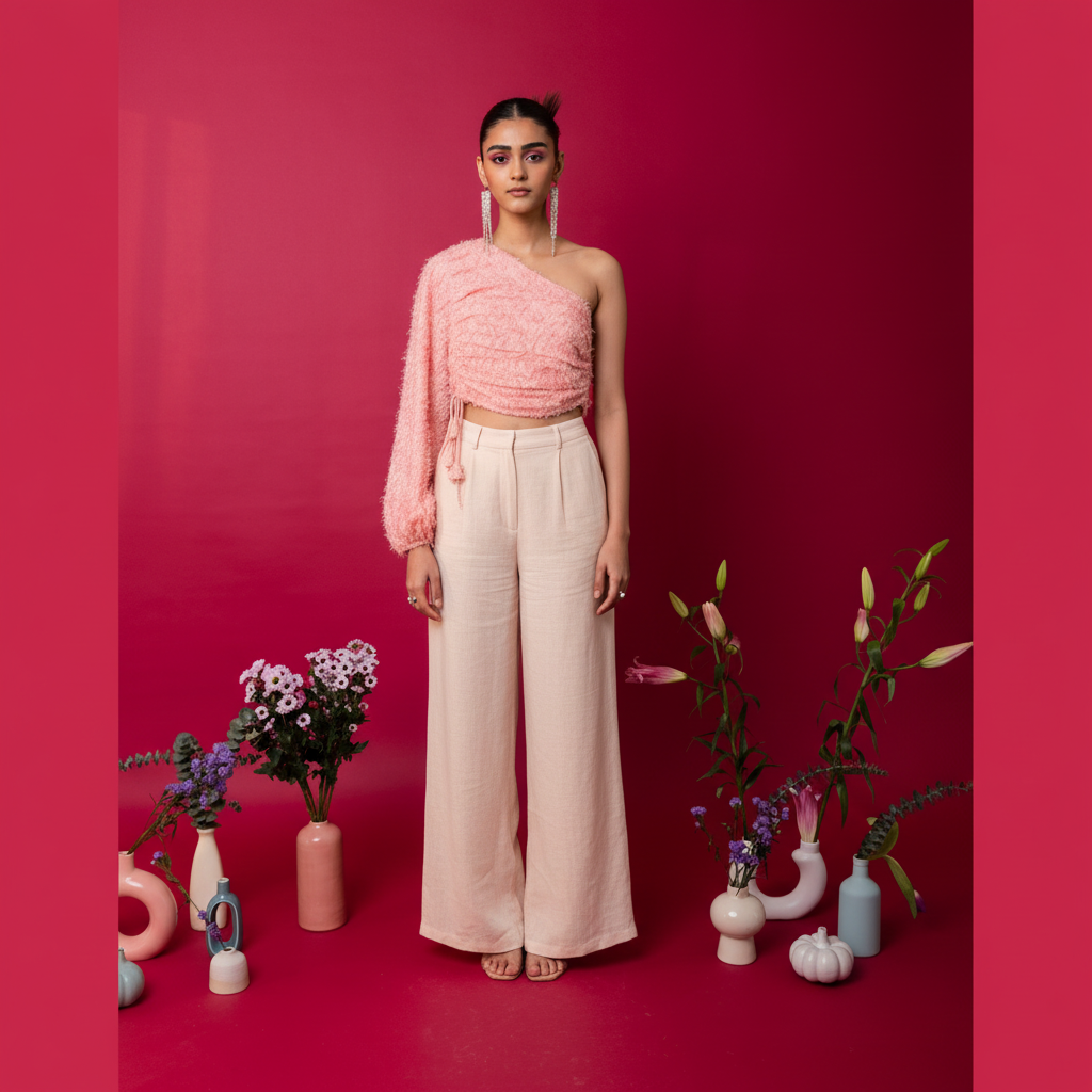 Asymmetric top with gathers and a delicate tie with embellished fabric tassels.
