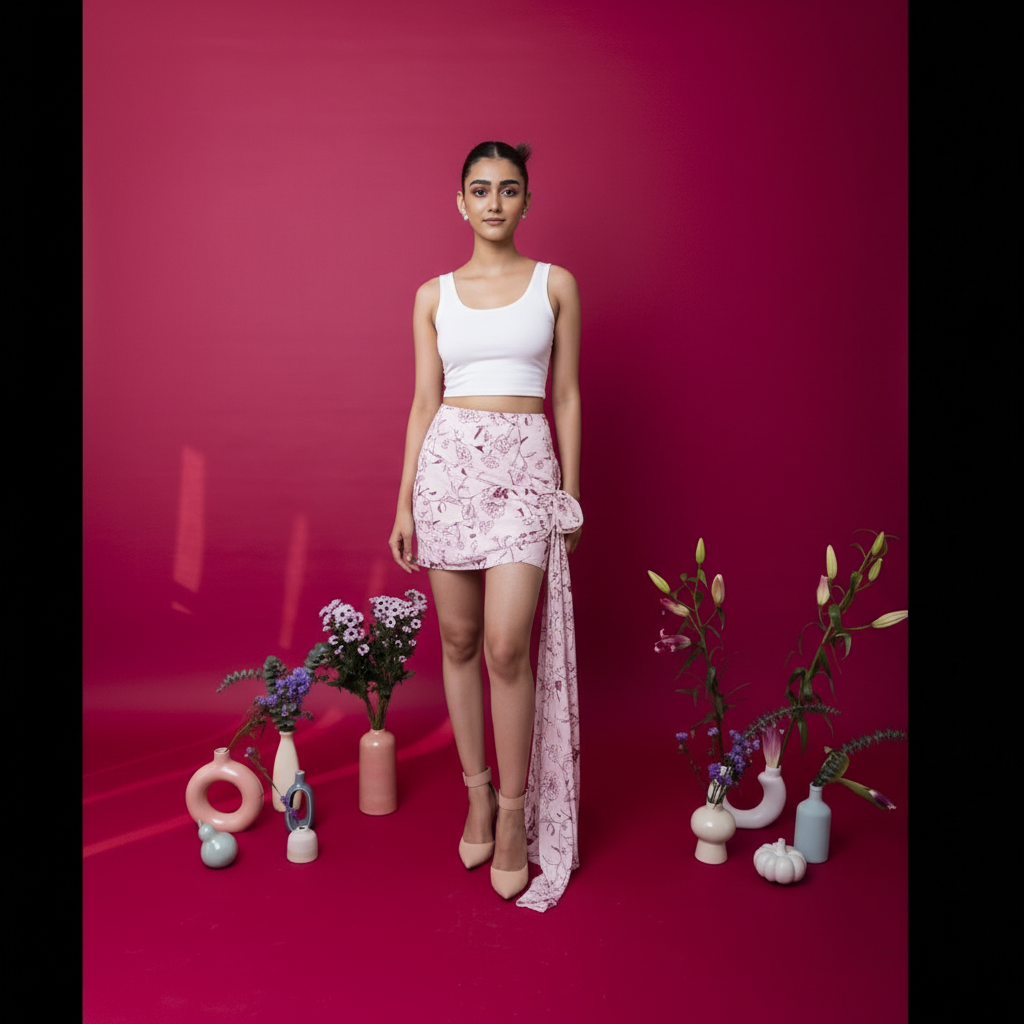 Draped mini skirt dipped in a soft, romantic print, further embellished with a fabric rose.