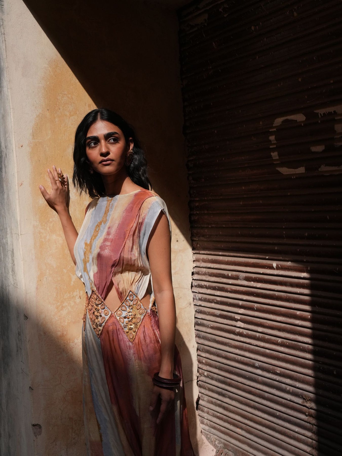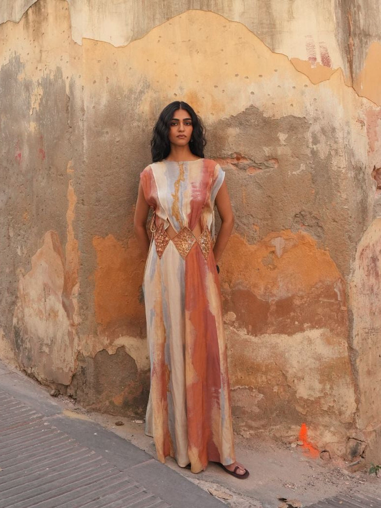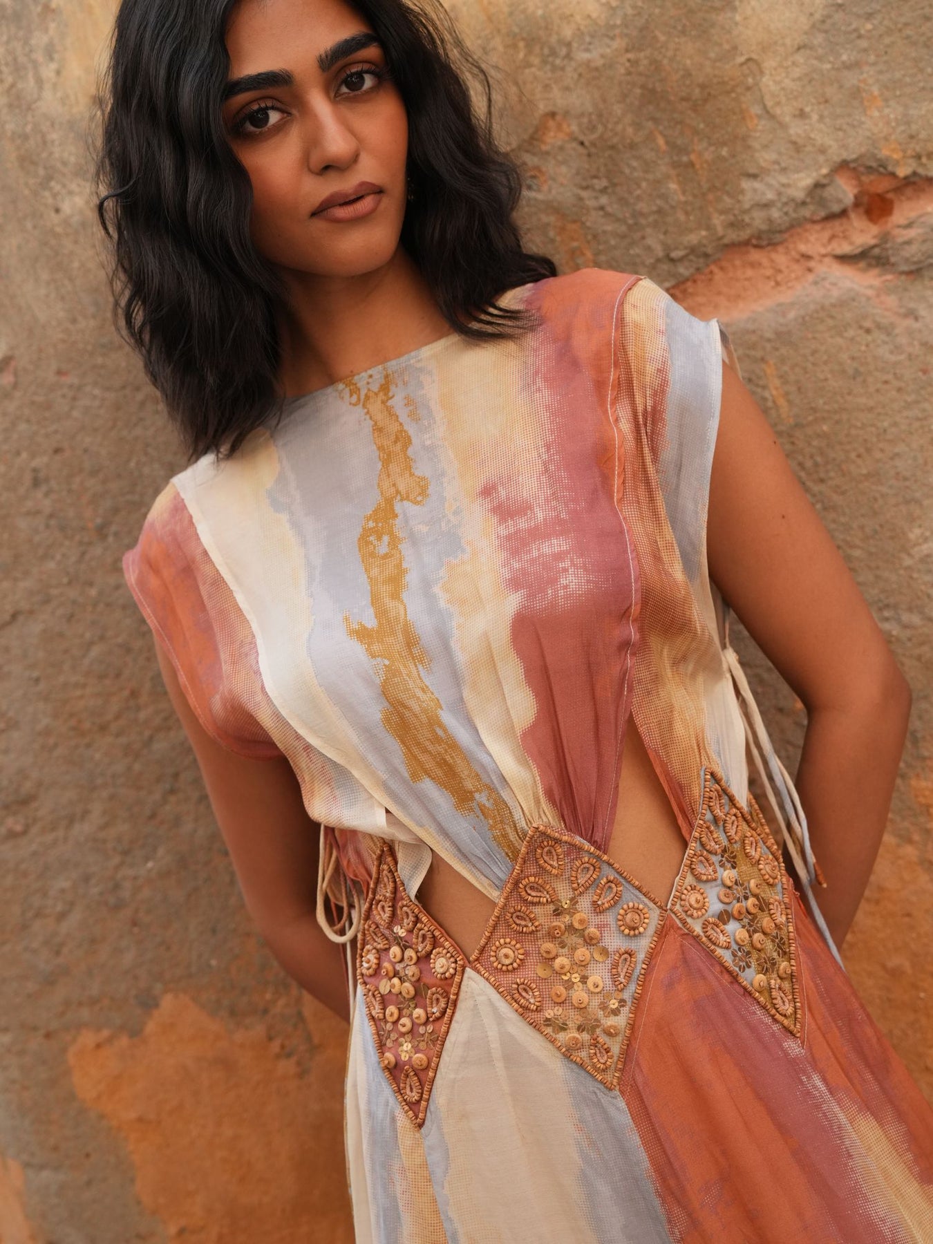 Description - long print dress with side ties - wooden and sequin embroidery on diamond panels - side zipper