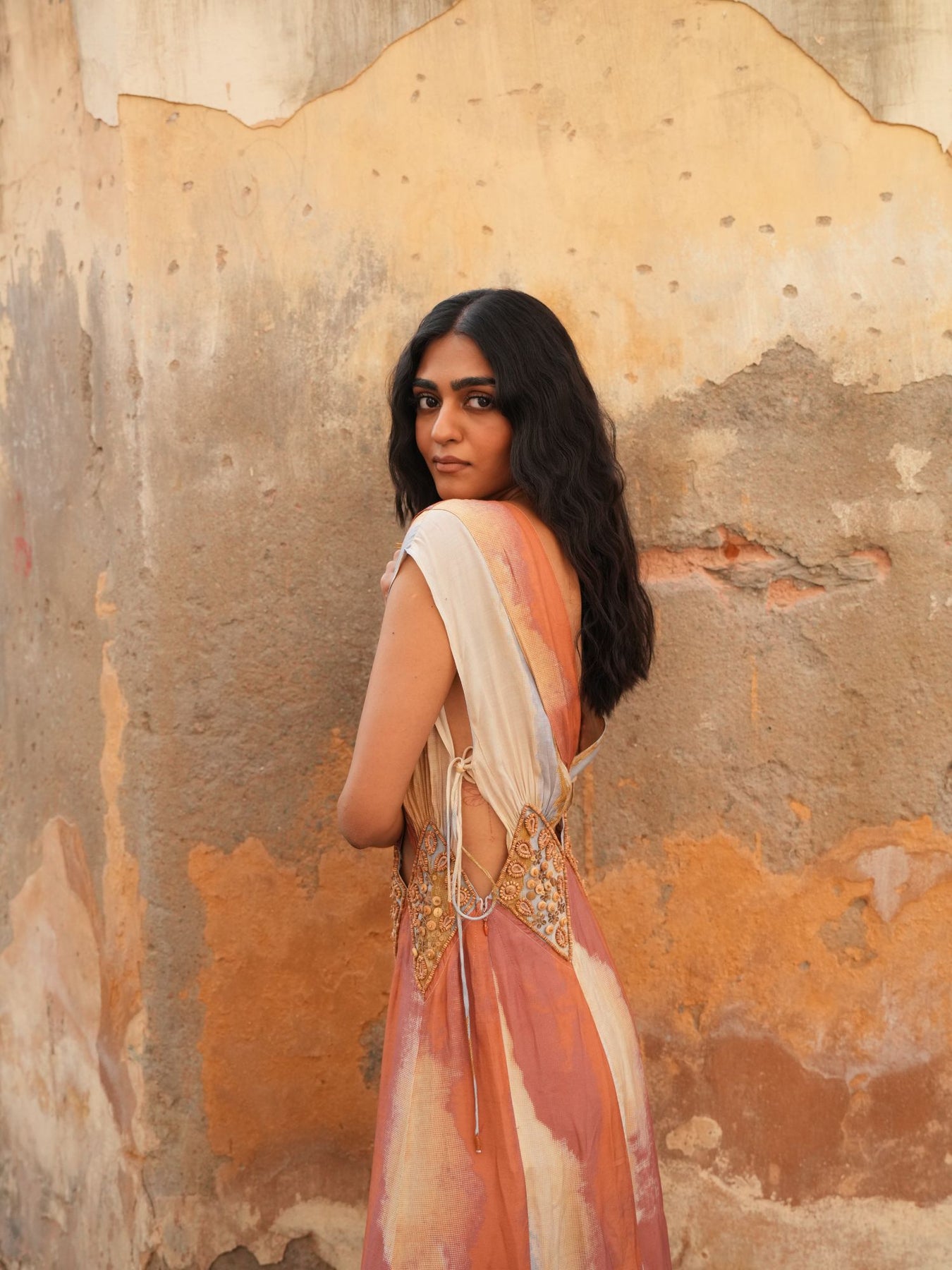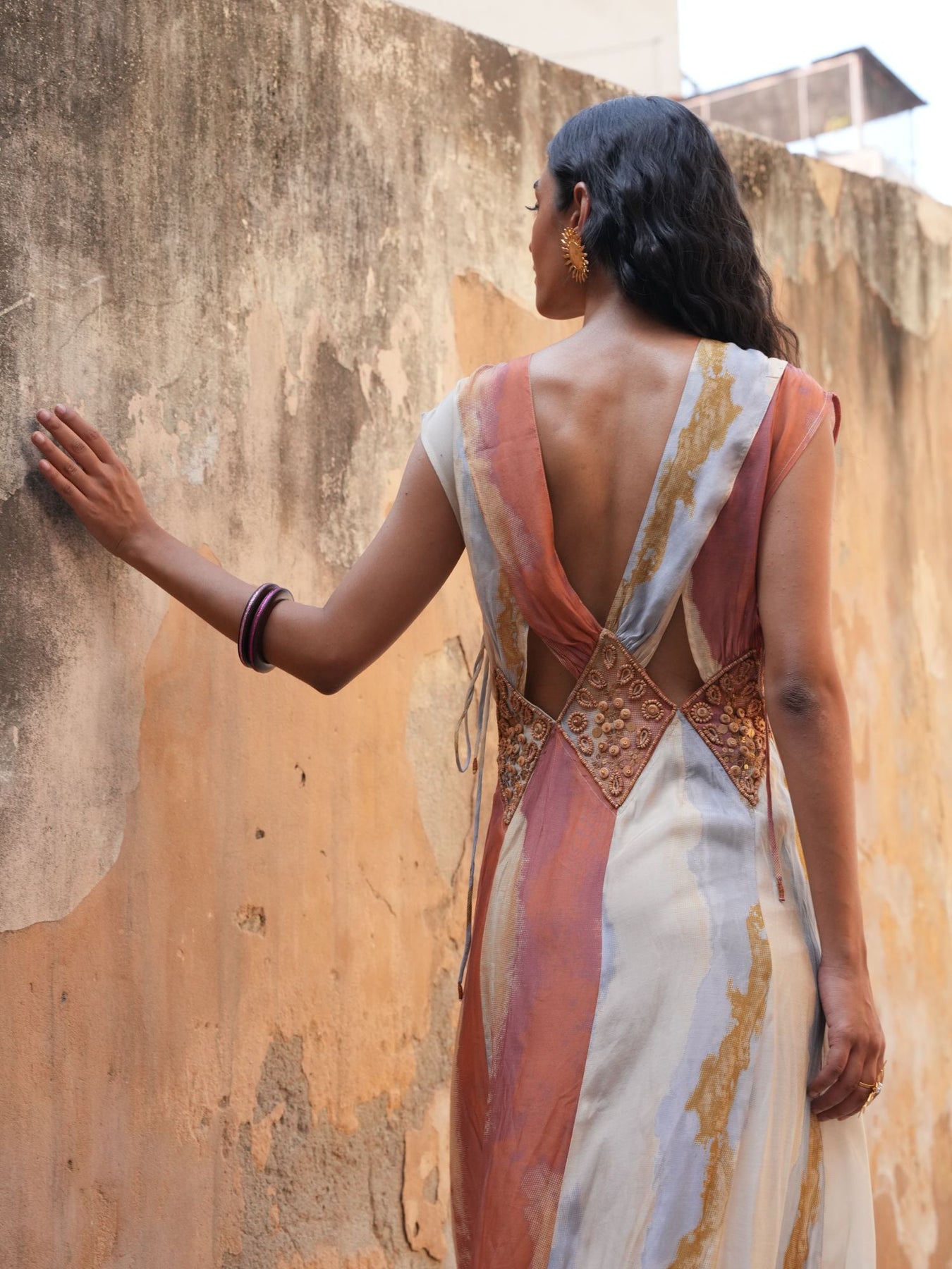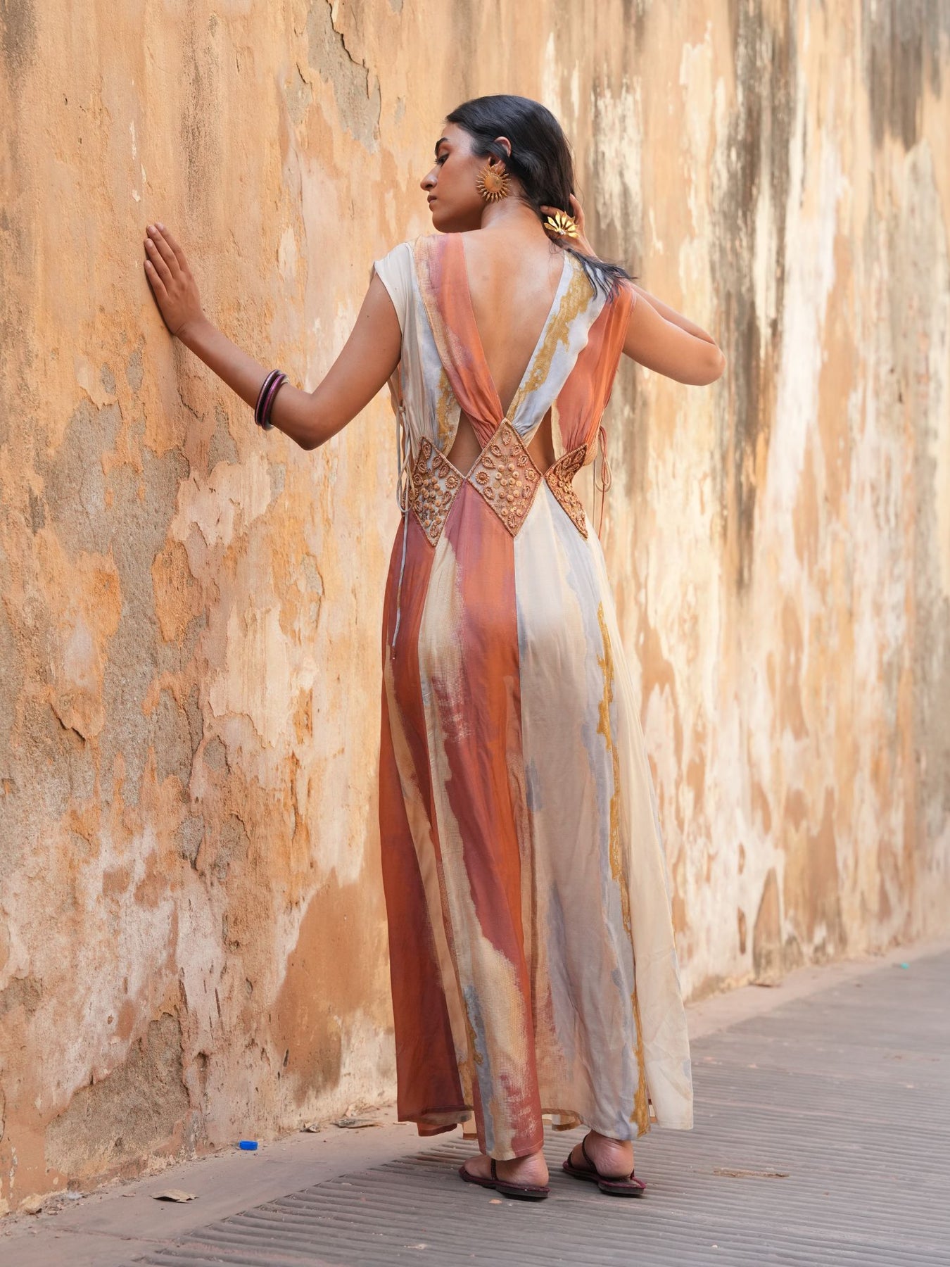 Description - long print dress with side ties - wooden and sequin embroidery on diamond panels - side zipper