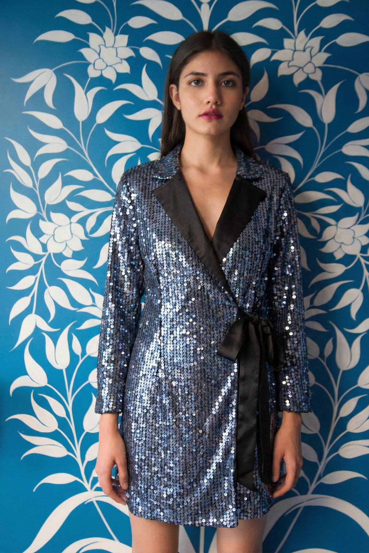 Structured mini blazer dress adorned with PVC free sequins is a party staple you will love slipping on. Shimmer the night away!